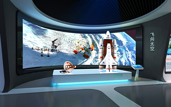 利用多媒體、模型和實物等技術手段再現人類太空探索的圓夢歷程。通過模擬演示和實物展示使人產生身臨其境的感覺。如利用三維動畫技術,生動地描述火箭發射神舟號飛船全演示,把火箭發射飛船和飛船在太空的運行及回收的三個過程,通過聲、光、電、動態模擬,把火箭發射飛船的場景展示得栩栩如生