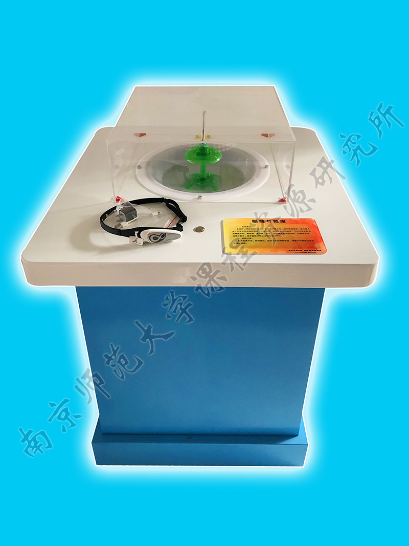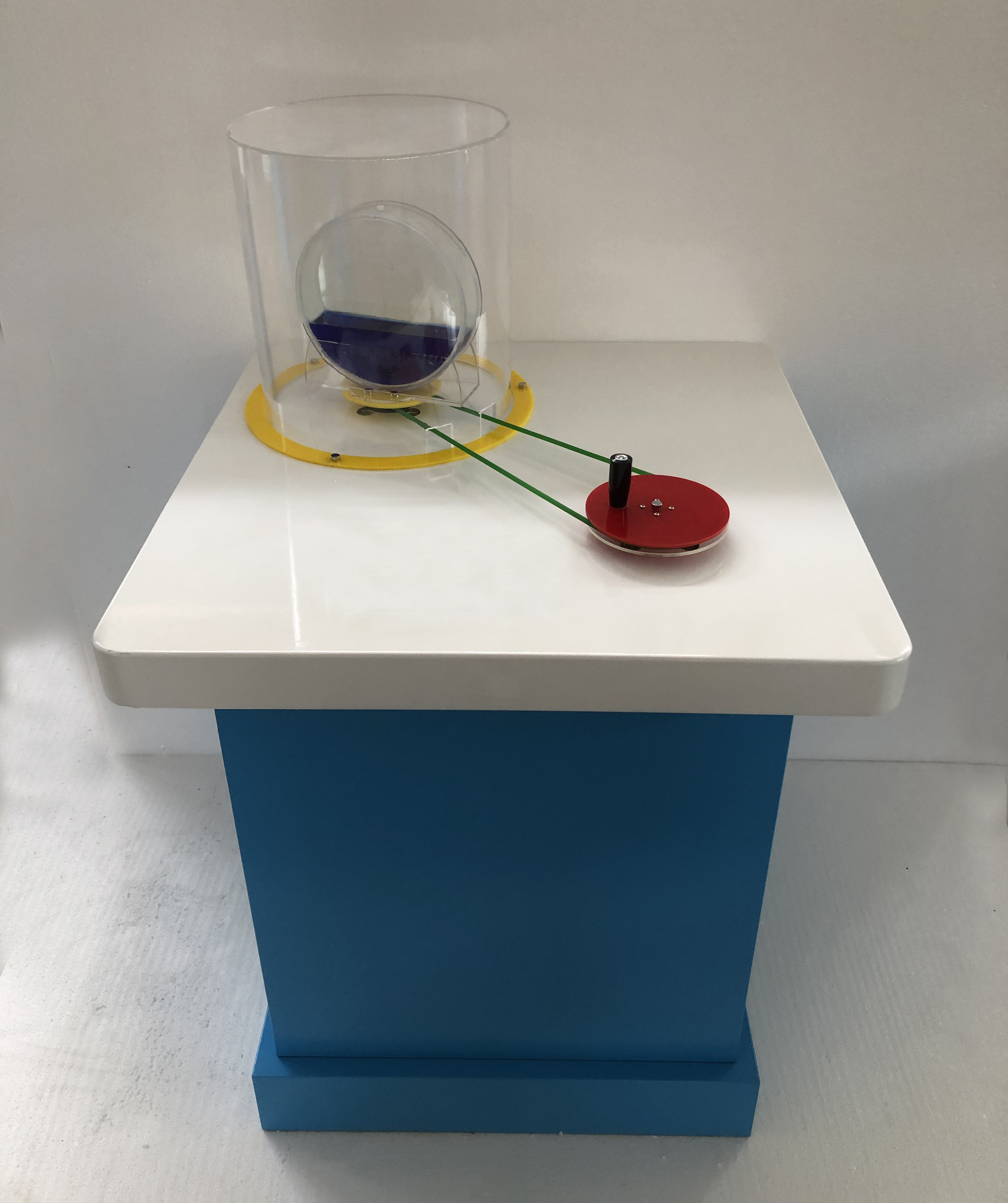 功能概述:此展項由可旋轉的轉臺、固定在旋轉臺上的演示裝置等構成。通過互動展示,讓觀眾了解離心現象。觀眾轉動手輪驅動轉盤轉動,可以發現由于離心力的作用,透明水箱中的液面發生了變化,中間低兩頭高。