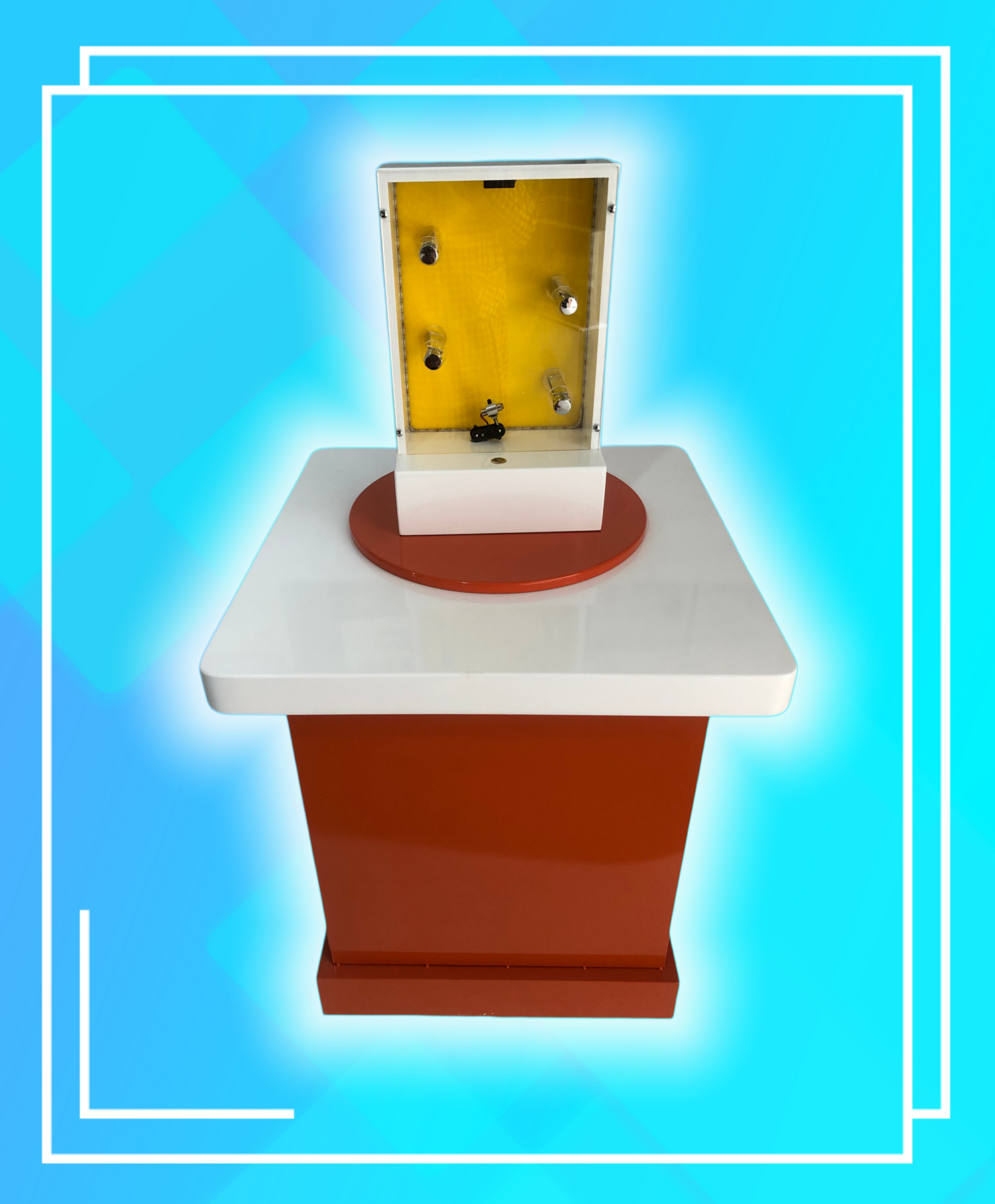 三、功能概述:展品由箱體、半透半反鏡、反射鏡、LED燈組、發光模型、擺動機構和操作手輪組成。前端是一面半透半反鏡,后端是反射鏡,燈光發出的光線被反射鏡反射回來,一部分透過半透半反鏡而被看到,另一部分被半透半反鏡再次反射到后端反射鏡,多次反射后形成諸多物體的像,無限重復的影像,一個比一個更遠,就像一條無盡的隧道。當擺動后端反射鏡時,光的反射路徑發生了變化,就會看到彎曲的光隧道。