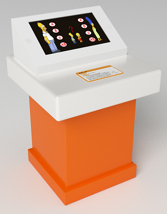 功能概述:此展項由展臺,電腦、觸摸屏、顯示器、血型與遺傳游戲軟件等構成,通過互動游戲,讓觀眾了解血型與遺傳的關系。通過觸摸屏操作,分別輸入父親和母親的血型,看看自己可能是什么血型。