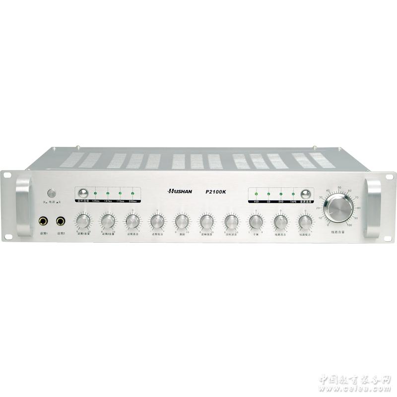 產品詳細介紹 ■ 五路話筒輸入(面板上兩路輸入、后面板上三 路輸入)并且各路話筒音量單獨可調; ■ 具有A組與A+B組功率輸出切換; ■ 話筒激勵、混響、反饋量獨立連續可調,話筒延時125ms、147ms、172ms、200ms四檔可選; ■ 話筒與線路高低音音調單獨可調。 規格參數
