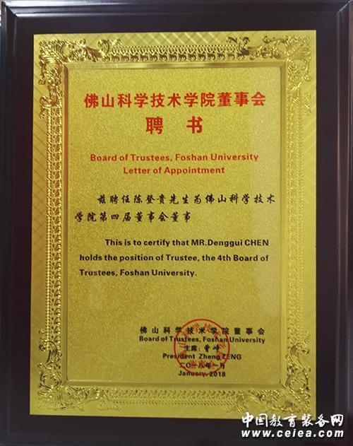 熱烈祝賀廣東廣視通科教設備有限公司董事長陳登貴先生受聘為佛山科學技術學院第四屆董事會董事。未來,廣視通將積極參與學校的改革發展,支持學校人才培養和基本建設,實現“雙向受益、共同發展”。
