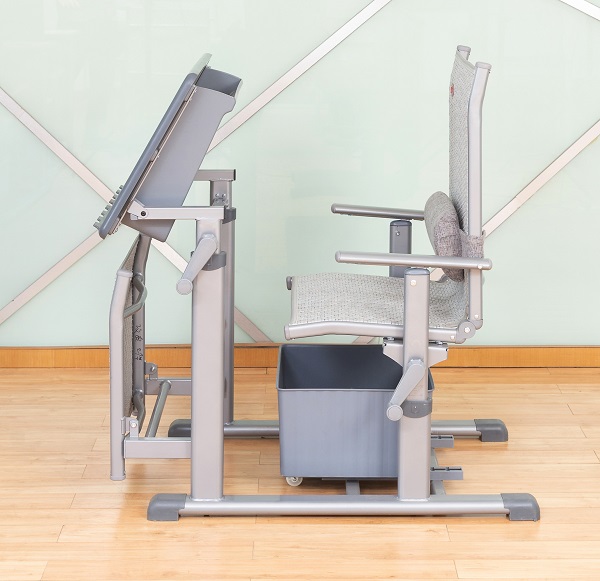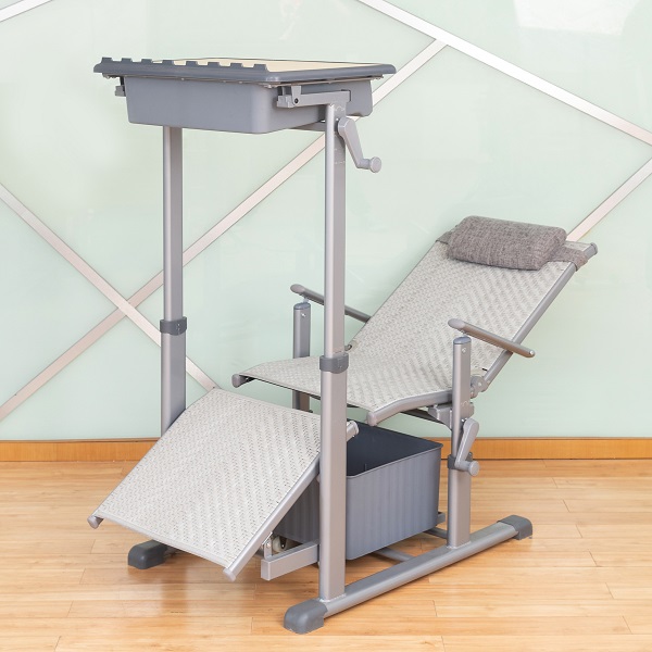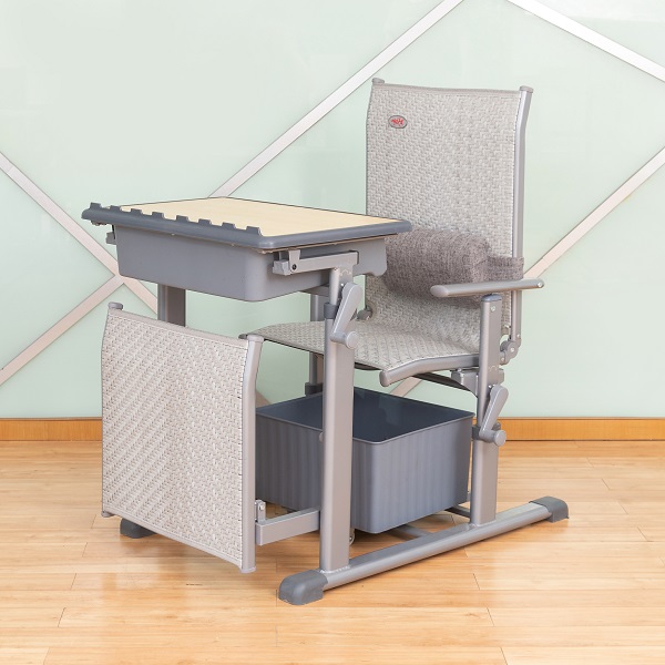 4、課椅規格及材料:460mm*380mm*(座椅面高420mm-460mm可手搖升降調節)±5mm,椅背可調最大傾斜度150°。座靠面料采用符合出口標準,沖擊100KG,靜壓180KG,60分鐘無損,抗紫外線不褪色,使用壽命8年以上的環保PE藤條。藤條規格為寬7.5mm±0.05mm*厚1.2mm±0.02mm,滕面邊沿采用PE材料包邊,尼龍線縫紉固定工藝。椅下設置370*330*190mm±3mm的PP材料的貯物箱,貯物箱底下前部設置雙滑輪,后部設置滑塊,與課椅下雙滑軌(ABS材質,規格315*30*20mm)的卡位裝置結構配合,貯物箱可前后自由限位滑動,可脫卸。