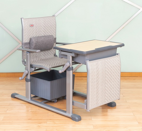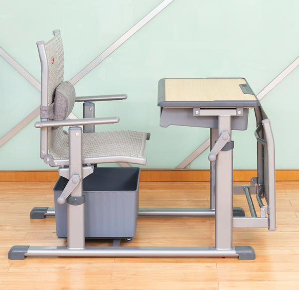 4、課椅規(guī)格及材料:460mm*380mm*(座椅面高360mm-460mm可手搖升降調(diào)節(jié))±5mm,椅背可調(diào)最大傾斜度150°。座靠面料采用符合出口標(biāo)準(zhǔn),沖擊100KG,靜壓180KG,60分鐘無(wú)損,抗紫外線不褪色,使用壽命8年以上的環(huán)保PE藤條。藤條規(guī)格為寬7.5mm±0.05mm*厚1.2mm±0.02mm,滕面邊沿采用PE材料包邊,尼龍線縫紉固定工藝。椅下設(shè)置370*330*190mm±3mm的PP材料的貯物箱,貯物箱底下前部設(shè)置雙滑輪,后部設(shè)置滑塊,與課椅下雙滑軌(ABS材質(zhì),規(guī)格315*30*20mm)的卡位裝置結(jié)構(gòu)配合,貯物箱可前后自由限位滑動(dòng),可脫卸。