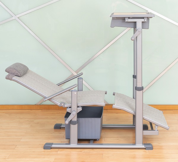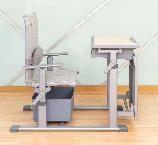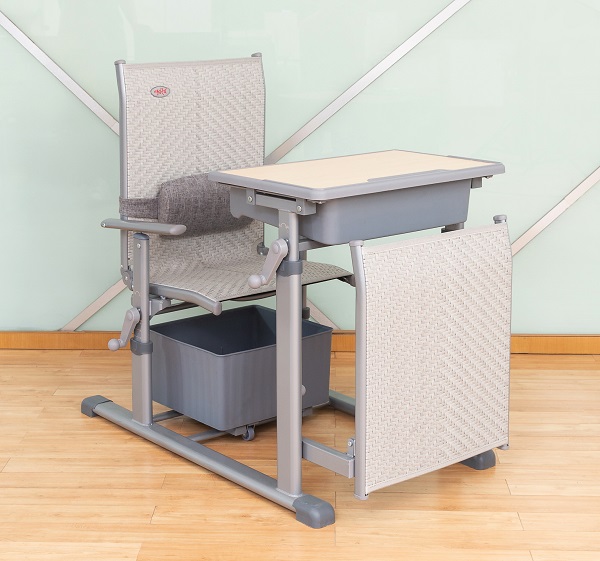 4、課椅規(guī)格及材料:460mm*380mm*(座椅面高420mm-460mm可手搖升降調(diào)節(jié))±5mm,椅背可調(diào)最大傾斜度150°。座靠面料采用符合出口標(biāo)準(zhǔn),沖擊100KG,靜壓180KG,60分鐘無損,抗紫外線不褪色,使用壽命8年以上的環(huán)保PE藤條。藤條規(guī)格為寬7.5mm±0.05mm*厚1.2mm±0.02mm,滕面邊沿采用PE材料包邊,尼龍線縫紉固定工藝。椅下設(shè)置370*330*190mm±3mm的PP材料的貯物箱,貯物箱底下前部設(shè)置雙滑輪,后部設(shè)置滑塊,與課椅下雙滑軌(ABS材質(zhì),規(guī)格315*30*20mm)的卡位裝置結(jié)構(gòu)配合,貯物箱可前后自由限位滑動,可脫卸。