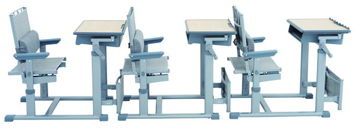 7、課桌椅午休模式:課桌通過單側(cè)手搖桿升高到午休高度,課椅靠背后仰,并打開PE藤質(zhì)擱腳板,借助桌下和椅下空間,可在0.88米前后間距實現(xiàn)150度原位舒適躺休。
