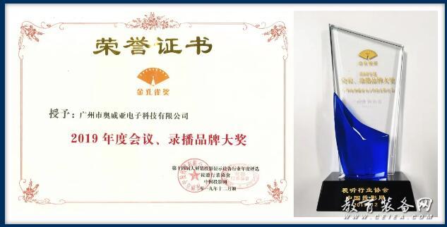 圖為奧威亞榮膺“2019年度會(huì)議、錄播品牌大獎(jiǎng)”與獎(jiǎng)牌