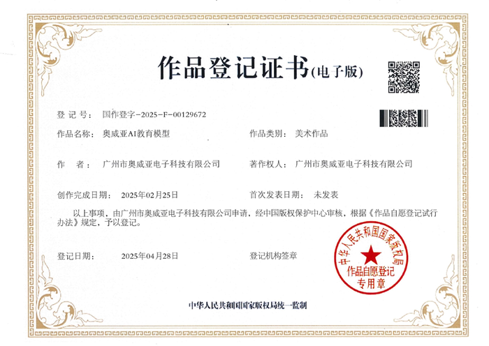 近日,奧威亞品牌建設迎來重要成果:公司自主研發的核心產品“奧威亞AI教育模型”及“師途智伴”——二者的專屬標識已經國家版權局審核,成功完成作品版權登記并正式獲得作品登記證書。這是奧威亞構建全面、立體品牌保護體系以及加固核心產品知識產權護城河的關鍵一步,也為奧威亞提升核心競爭力和企業軟實力奠定了堅實的法律基礎。