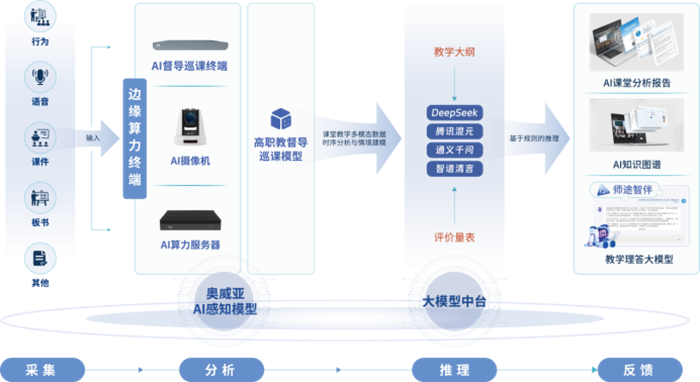 在應(yīng)用價(jià)值方面,系統(tǒng)深度整合DeepSeek、騰訊混元、通義千問(wèn)等主流大模型,具有強(qiáng)大的推理能力�;趭W威亞AI感知模型提供的多模態(tài)數(shù)據(jù),輸出更精確的課堂評(píng)價(jià)和改進(jìn)建議,構(gòu)建起教育教學(xué)“全息數(shù)據(jù)采集-智能證據(jù)挖掘-動(dòng)態(tài)策略生成-教學(xué)實(shí)踐提升”的閉環(huán)體系,為課堂教學(xué)質(zhì)量評(píng)估、整改和推優(yōu)提供新路徑。