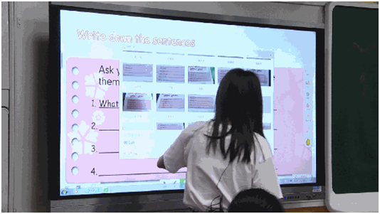 學(xué)生平板拍照分享到大屏,多位同學(xué)展示學(xué)習(xí)成果(支持四分屏)。