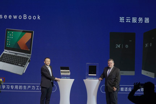 2.希沃聯合英特爾正式發布seewoBook、班云服務器。視源股份未來教育集團總裁黃明寒與英特爾物聯網事業群零售事業部副總裁Jose avalos一同揭開新品面紗,共同見證這個神圣而偉大的時刻!