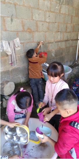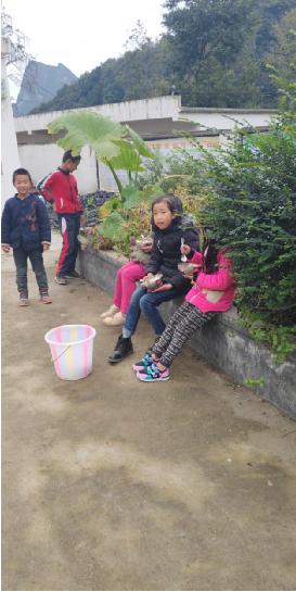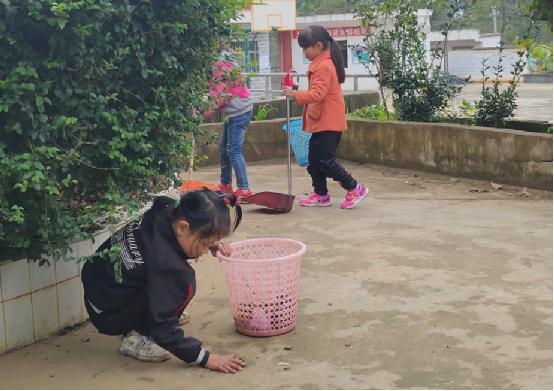 不一會兒孩子們上午的課程就結(jié)束了,因為孩子們離家比較遠,所以都會在學校吃午飯。那天剛好是一周一次的大掃除日,孩子們需要先清潔校園,然后才吃午飯。一個個比掃帚矮一大截的小朋友,沒人指揮、沒人監(jiān)督,都自覺認真地清掃校園,當天的溫度在10度左右,我穿著羽絨服幫忙掃樹葉都覺得冷冷的,可是有的小朋友就穿了一兩件單薄的衣服,流著鼻涕,小手凍的紅紅的,還在地上撿樹葉、掃樓梯、擦門窗。看著一個個忙碌的小身影,我很心痛,到底是怎樣一種生活環(huán)境,才讓他們有著這般和年紀不符的成熟懂事啊。