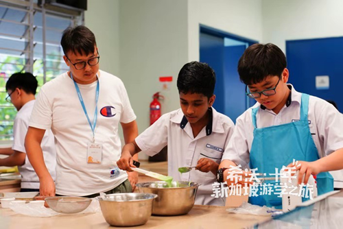 “在新加坡,我們崇尚學(xué)生從娛樂(lè)和探索中學(xué)習(xí)、從藝術(shù)中學(xué)習(xí)、走到大自然中去學(xué)校,希望學(xué)生不僅學(xué)到語(yǔ)言、科學(xué)等知識(shí),還能掌握基本的生活技能、發(fā)展個(gè)人興趣愛(ài)好、學(xué)會(huì)關(guān)愛(ài)社會(huì),所以我們還開(kāi)設(shè)了家政課、小提琴、古箏等等課程,全面培養(yǎng)學(xué)生的綜合素養(yǎng)。”學(xué)校主任分享道。家政課給大家留下了深刻的印象,老師們走進(jìn)課堂,與學(xué)生一起體驗(yàn)了一把蛋糕烘焙課。