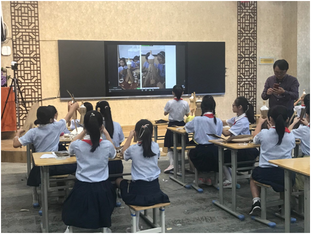 楂林小學的竹藝課上,兩校學生作品通過投屏展示