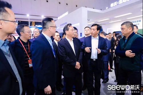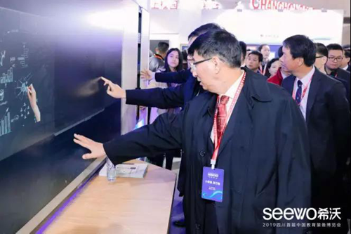 現場,中國教育裝備行業協會會長、四川省教育廳廳長、四川省教育廳副廳長等領導來到希沃展位進行巡視。從希沃易課堂智慧課堂解決方案,到基于希沃交互智能錄播搭建的專遞課堂,再到研討型智慧教室及數據駕駛艙,場景多樣、技術創新的希沃展區令眾領導不時駐足觀摩并上手體驗。