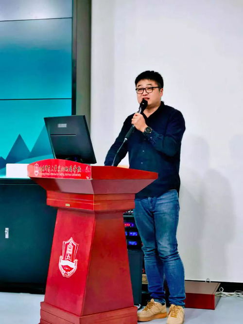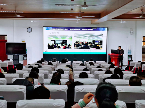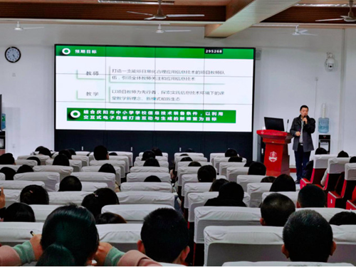希沃教育研修院高級教師顧問朱磊對慶陽市信息化教學改革做了交流,他從名師工作室的成立條件、發展方向和意義等方面,給慶陽市的老師們做了介紹,并把全國各地的名師工作室經驗做了分享。