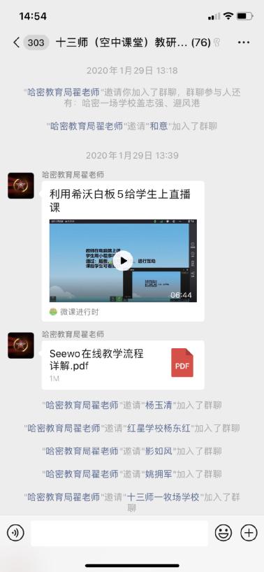 希沃云課堂方案在得到全師教育系統的認可后,十三師教育局翟世華老師于1月29日創建了十三師希沃云課堂管理員培訓微信群,從軟件下載路徑、注冊方法、軟件教程視頻等方面,給管理員做了基礎培訓,各學校管理員通過系統學習和操作,將希沃云課堂使用方法再通過各學校微信群培訓給一線的教師。