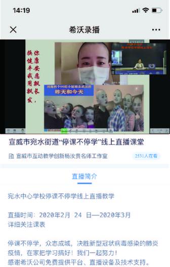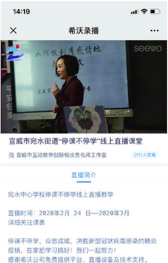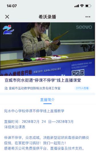 學校于2020年2月24日起,周一至周五每天對全體學生開展宛水中心學校線上教學直播課程,課程內容豐富有趣,分別有:疫情防控知識宣傳;疫情下對學生的愛國主義宣講;經典、古詩文教學欣賞;“閱讀悅美”讀書活動;數學趣味教學;唱歌、舞蹈教學欣賞;“小巧手、大智慧”手工教學;“寫好中國字、做好中國人”書法教學;英語趣味活動;每天小健身活動;家庭教育小故事分享等課程內容。學生通過登錄希沃錄播網址、分享鏈接或掃描二維碼便可在手機、電腦、平板等端口進行觀看學習。
