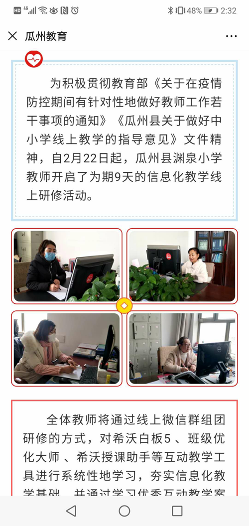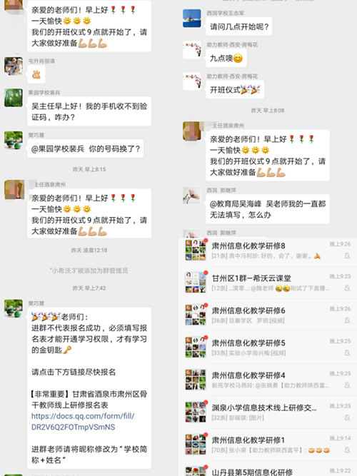 甘肅省張掖市山丹縣電教中心負(fù)責(zé)人大年初三就聯(lián)系希沃工作人員,溝通全縣教師運用希沃白板做直播課的事宜。第二天,由該縣電教中心牽頭、南關(guān)學(xué)校嚴(yán)校長主導(dǎo)創(chuàng)建了希沃云課堂直播培訓(xùn)群,希沃團隊及時開展組織培訓(xùn)、答疑解惑,為當(dāng)?shù)乩蠋煹摹翱罩姓n堂”保駕護航。