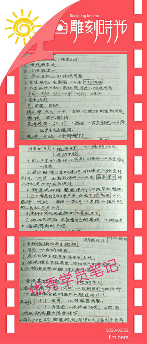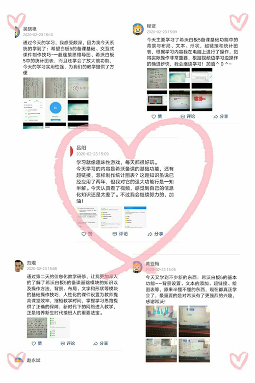 “停課不停學(xué)”,不停學(xué)的不僅僅是學(xué)生,還有眾多的一線教師,他們用行動詮釋著師者的責(zé)任和使命。通過線上研修活動,老師們對希沃白板、班級優(yōu)化大師、希沃授課助手等互動教學(xué)工具進(jìn)行系統(tǒng)學(xué)習(xí),通過視頻的方式打卡實操作業(yè),鞏固當(dāng)天學(xué)習(xí)的理論知識,檢驗當(dāng)天學(xué)習(xí)成果,分享當(dāng)日學(xué)習(xí)心得,并通過學(xué)習(xí)優(yōu)秀教學(xué)案例,促進(jìn)信息化技術(shù)與學(xué)科的融會貫通。