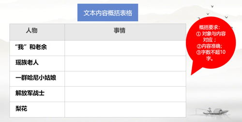 ①內容梳理題,要求學生根據表格提示整體把握內容;
