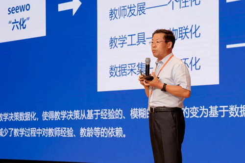 隨后,視源股份未來教育集團(希沃)副總裁魏振水在歡迎辭中表達了對與會領導、專家與一線教師們蒞臨希沃的感謝,并介紹了希沃在打造智慧教育上的“六化”特點,即可視化、檔案化、數據化、個性化、物聯化、閉環化。他表示希沃的“六化”符合教育信息化的發展方向、育人規律、信息化價值與家校共育需要。