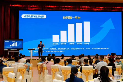 中國民辦教育協會常務理事、藍天教育集團董事長趙恒龍分享了他自2016年以來的信息化教學改革探索之路。藍天中學從建校初期的200名學生,增長到現在的2000多名學生,從成績倒數到目前的“第一平臺”,2018年、2019年的中考優秀率全縣第一,體考、數理化實驗考試、信息技術考試全縣第一。他認為民辦教育要主動求變,從規模發展轉向內涵發展,加大教學改革力度,推進智慧課堂建設,引領教育發展潮流。