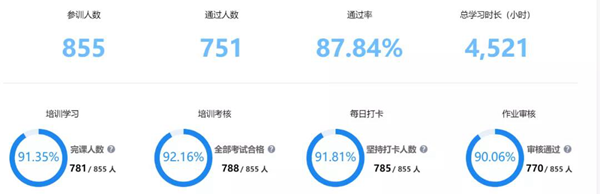 第一階段活動(dòng)時(shí)間是5月16日-23日,采用“互聯(lián)網(wǎng)+線上研修”的形式進(jìn)行。此次線上培訓(xùn)活動(dòng)以“名師課堂學(xué)習(xí)+每日小測(cè)+結(jié)營(yíng)大作業(yè)”的形式,邀請(qǐng)老師加入指定學(xué)習(xí)社群,通過(guò)線上學(xué)習(xí)平臺(tái),完成整個(gè)培訓(xùn)學(xué)習(xí)。根據(jù)統(tǒng)計(jì)數(shù)據(jù)顯示,此次培訓(xùn)在線時(shí)間長(zhǎng)達(dá)4521小時(shí),參與人數(shù)高達(dá)855人,培訓(xùn)通過(guò)率為87.84%。