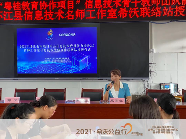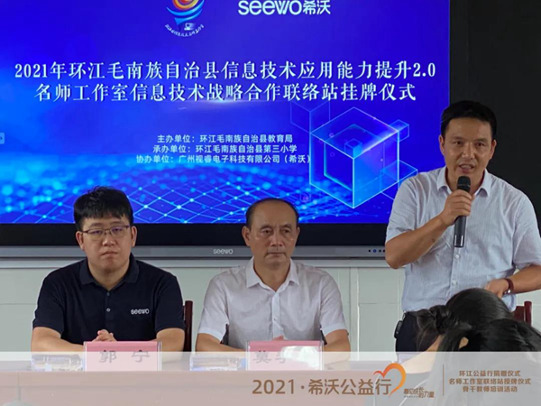 2021年8月19日,希沃在環江毛南族自治縣第三小學舉行了希沃公益行設備捐贈儀式。同時,希沃攜手環江毛南族自治縣教育局,共同助力環江縣名師工作室骨干教師成員開展了為期兩天的“粵桂教育協作項目”研修班活動,讓骨干教師團隊就創造更多樣化教學模式展開了深度的研修和探討。環江毛南族自治縣教育局莫李全委員、電教站黃廣正站長、譚炤宇副站長、師培中心覃品優老師、林文強老師、環江三小校長羅懿校長、希沃廣西區域總經理郭寧等領導受邀出席了本次活動,并與教師們共同見證了環江毛南族自治縣信息技術名師工作室希沃聯絡站授牌儀式。
