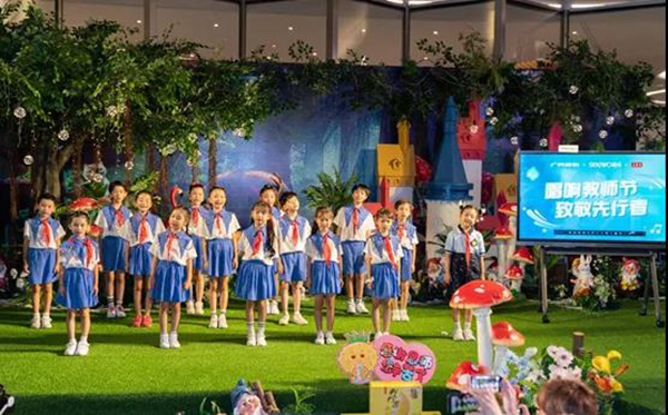 在花地灣生活館,為了給老師過一個輕松的教師節(jié),希沃邀請了來自棒棒堂少兒藝術(shù)團的一群小朋友為到場的20余位老師送上快閃表演,《聽我說謝謝你》《老師》兩首合唱在生活館的小舞臺上唱響。