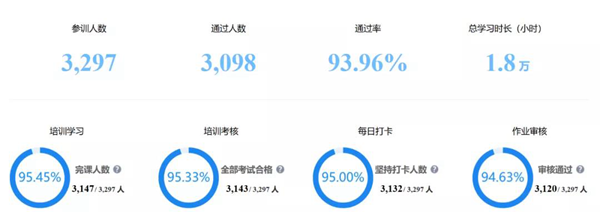 而接下來的線上研修課程分為了7天去完成,共涵蓋47節課程。全縣共有3147名教師完成了全部課程的學習,總學習時長1.8w小時,課程完成率達到95.45%。第三階段,在課程最后的7天提交大作業環節,培訓通過率也達到了93.96%。此次線上培訓活動效果顯著,提高了教師學習的積極性。
