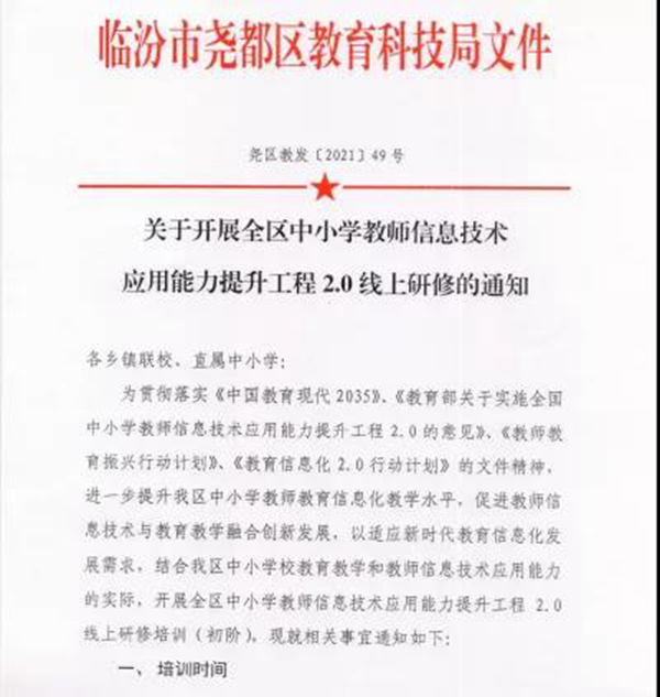 為貫徹落實教育部《關(guān)于實施全國中小學(xué)教師信息技術(shù)應(yīng)用能力提升工程2.0的意見》的工作要求,并響應(yīng)教育部《關(guān)于在疫情防控期間有針對性地做好教師工作若干事項的通知》統(tǒng)一部署,臨汾市堯都區(qū)教育局基于本區(qū)域的現(xiàn)狀,積極探索教師線上培訓(xùn)研修模式,通過組織開展“堯都區(qū)中小學(xué)教師信息技術(shù)應(yīng)用能力提升工程2.0線上研修活動”,來提升區(qū)域內(nèi)中小學(xué)教師教育信息化教學(xué)水平,促進(jìn)教師信息技術(shù)與教育教學(xué)相融合的創(chuàng)新發(fā)展。