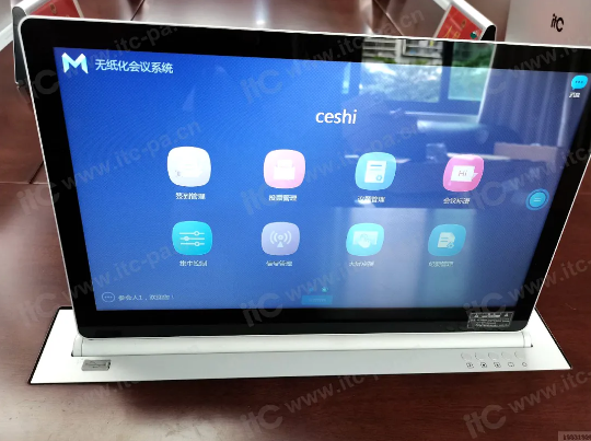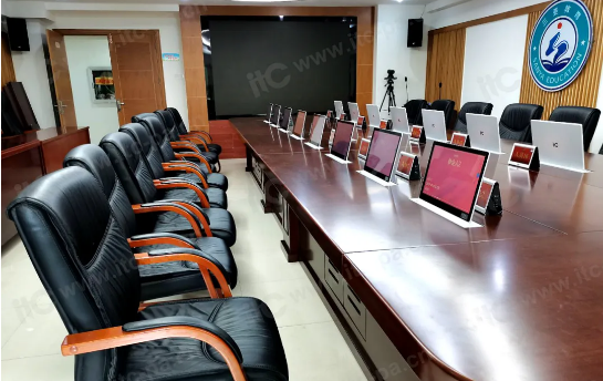 綜合教育局的實際情況,itc根據用戶需求及室內布局,在會議室每個座位設計一臺觸控無紙化智能桌面與終端主機相結合的無紙化會議系統,把會前、會中、會后的全部會議功能融入到系統當中,增加會議簽到、投票、信息交流、會議服務、人員管理、會議管理等應用功能,實現了整個會議的智能管控。
