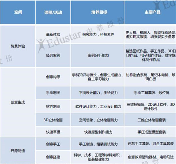 、加工耗材、通用設備、文化設備等多種材料和設備,能讓教師和學生開展多樣化創(chuàng)意、設計和制造活動。