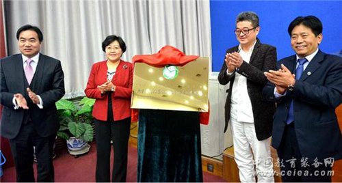 中教啟星總裁周建宇(左一)、內蒙古教育廳副廳長楊劼、中廣國際董事長王文斌、內師大校長云國宏為內蒙古自治區教師教育協同創新聯盟揭牌