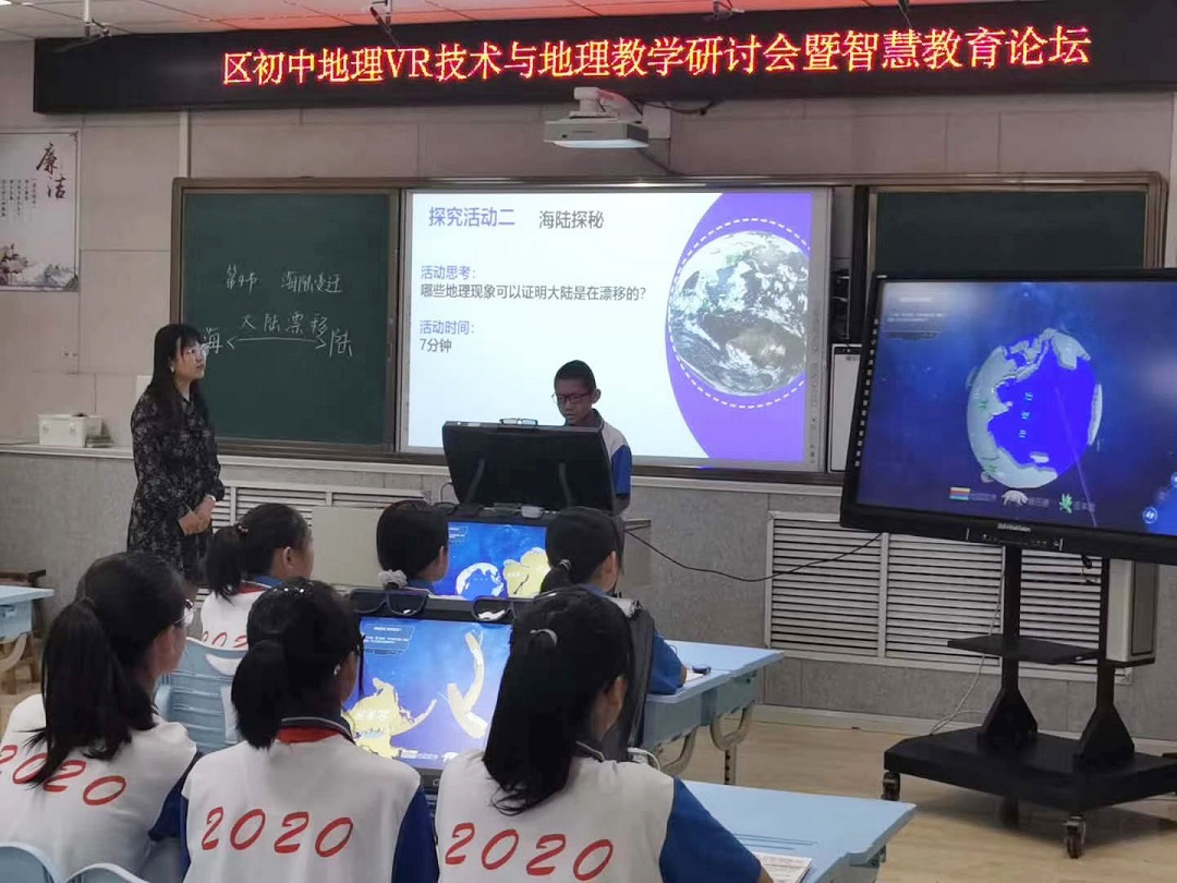 青島西海岸新區第四初級中學王景芳老師利用VR技術展示了獨特的“三維立體”的“海陸變遷”課堂。整節課設置三道探究題目,通過任務驅動自主探究,引導學生利用中教啟星寰宇地理VR教學系統完成探究,將原本抽象的大陸漂移與板塊運動變得可“觸”可“控”。