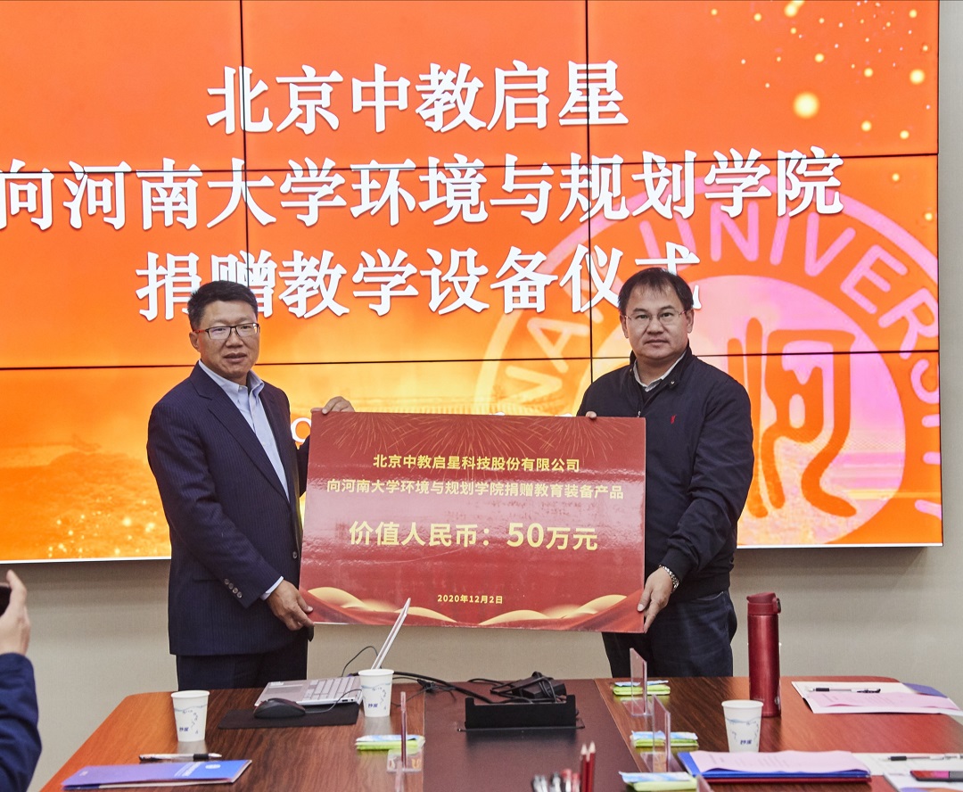 12月2日,在八朝古都開封,中教啟星向河南大學環境與規劃學院捐贈教學設備儀式在該學院舉行,中教啟星總裁王天祥,教研中心總監王秋平,渠道部總監馬爭科,河南省銷售負責人楊秉奮,河南大學環境與規劃學院黨委書記鄭洪濤,執行院長、黨委副書記喬家君黨委副書記徐小軍,副院長潘少奇,地理科學系教師張廣花等領導出席了本次捐贈儀式。