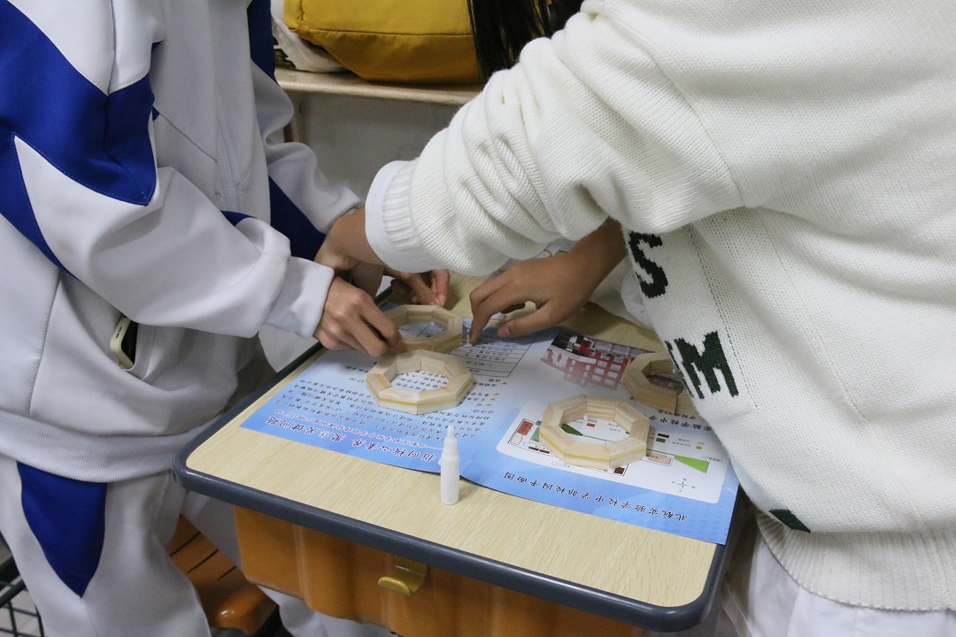 課程的后半段是同學(xué)們最喜歡的手工環(huán)節(jié)。譚老師將參加課程的同學(xué)們分為兩人一組,每組一起協(xié)作,利用中教啟星提供的材料包制作出一口轆轤井。