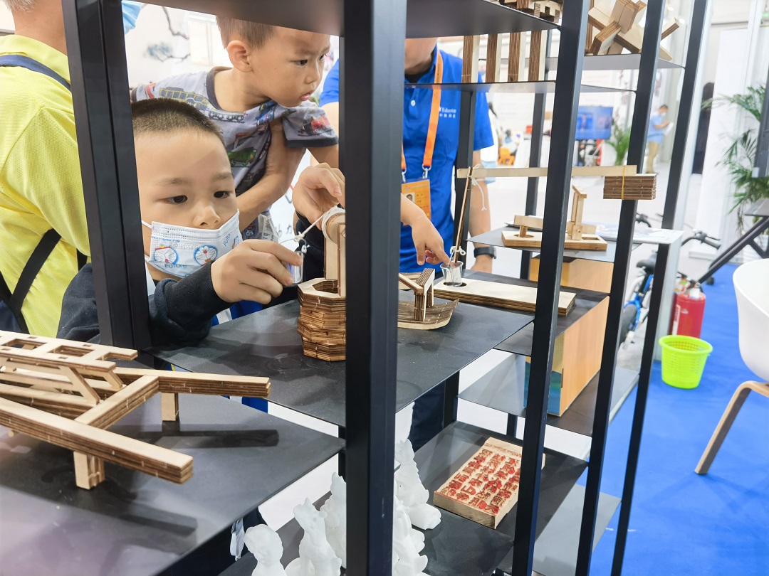 中教啟星參加本次服貿會中重點展示了勞動教育的系列課程,如桔槔、轆轤井、踏碓等,并成為展區中最大看點,吸引諸多大人小孩前來參觀體驗。
