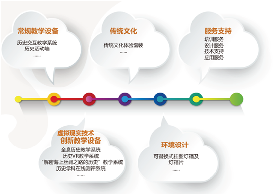 中教啟星歷史學科創新型專用教室解決方案以數字化與虛擬現實技術為核心,讓教學專用設備與資源、創新教學設備與課程、傳統文化體驗套裝、模型教具及教室文化五大核心模塊真正的融入歷史教學應用中,方案創新應用虛擬現實VR教學系統、歷史交互教學系統、全息教學系統等一批虛擬現實設備和數字化設備,能夠優化歷史教學目標、優化學科教學過程、強化歷史德育意義,打破學校歷史課程教學陳舊不變的教學方式,滿足學生與教師的需求,幫助學生構建歷史認識、做好歷史教師的腳手架。