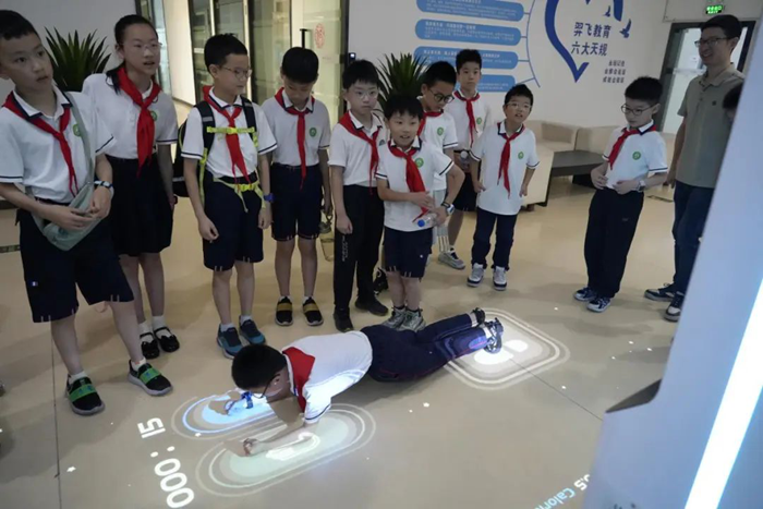 告別球幕影院,學生們來到了運動一體機區域。各種新奇的運動設備前,大家躍躍欲試。通過與屏幕中的虛擬場景互動,跳繩、踢球、跑步等運動變得趣味十足。學生們在歡快的氛圍中不僅鍛煉了身體,還深刻體會到科技為運動帶來的創新活力,原來運動也可以如此智能有趣。