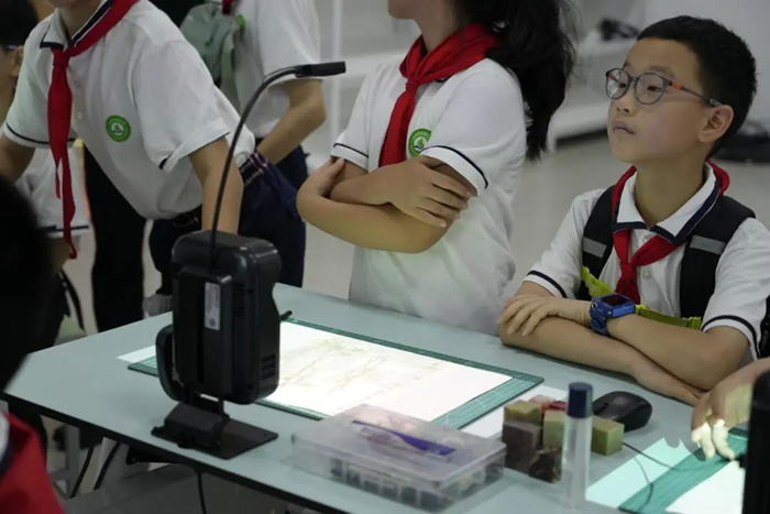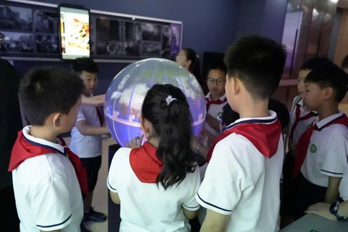 隨后,數字化地理教室成為了隊員們探索世界的新窗口。巨大的多媒體球幕投影演示儀上,山川河流、國家城市清晰可見。通過 AR 地理沙盤,隊員們感受不同的地理環境,親手感受地形的起伏變化,原本抽象的地理知識變得生動鮮活,讓他們對地球家園有了更直觀深刻的認識。