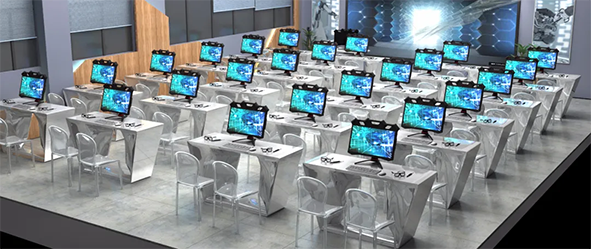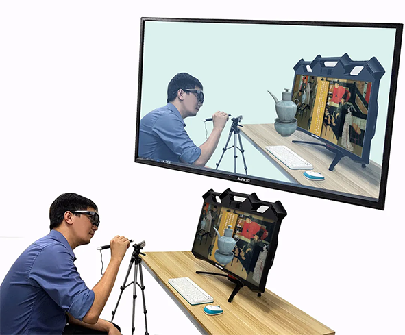 學生可自行操作桌面VR交互一體機來學習歷史知識,該設備采用120Hz 1080p 高清24寸3D立體顯示器,結合虛擬現實技術(VR)和增強