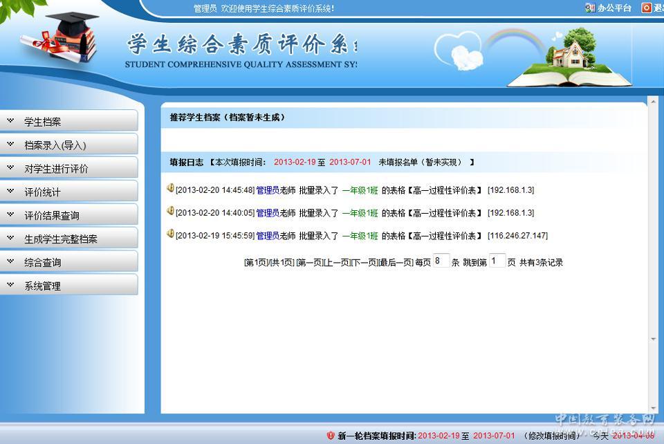 開啟評價配置評價基礎信息,錄入所有學生的檔案信息,維護檔案信息,管理開關,查看所有報表信息。導出各種檔案報表。