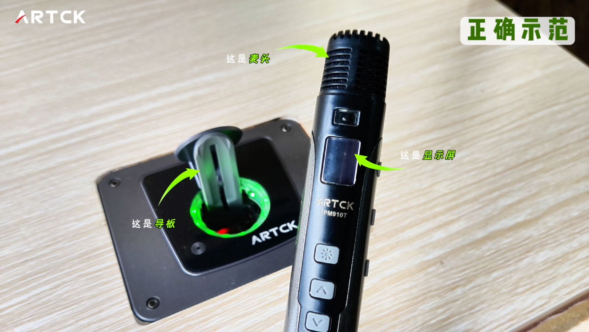 顯示屏背對導板,麥頭朝上,松手即可;