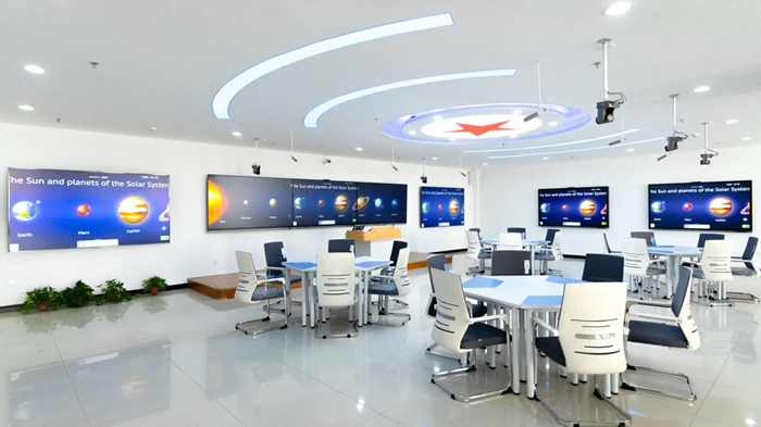 海信商用顯示助力河北外國語學院打造777間以雙屏智慧黑板為核心的智慧教室,集成智能監(jiān)控、人臉識別系統(tǒng),實現(xiàn)教學互動、設備管控,支持線上線下融合的教學模式,賦能教學場景的數(shù)字化轉型。