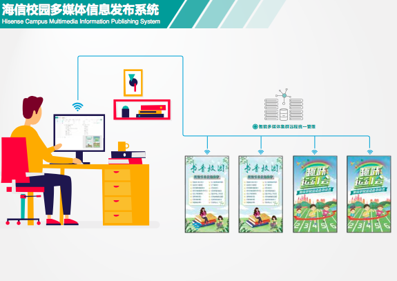 海信校園多媒體信息發(fā)布系統(tǒng),為用戶提供校園信息文化,節(jié)目制作發(fā)布平臺(tái)。平臺(tái)可進(jìn)行校 園多媒體統(tǒng)一發(fā)布信息,文本,節(jié)目終端發(fā)送,統(tǒng)一管理,為構(gòu)建校園文化信息展示助力。系統(tǒng)部署方便,快捷,通過(guò)網(wǎng)頁(yè)或移動(dòng)端即可登錄操 作使用,讓管理不再局限。持對(duì)不同類型素材上傳,對(duì)圖片、視頻、音樂(lè)等進(jìn)行分類 管理,滿足學(xué)校個(gè)性化宣傳需求。上傳,下載采用先進(jìn)技術(shù),支持超大、超高清視頻穩(wěn) 定上傳和下載,為使用者帶來(lái)便利,節(jié)省時(shí)間。所有操作都可通過(guò)靜默采集,直接形成可視化數(shù)據(jù)報(bào)表, 利于管理者分析統(tǒng)計(jì)數(shù)據(jù)。