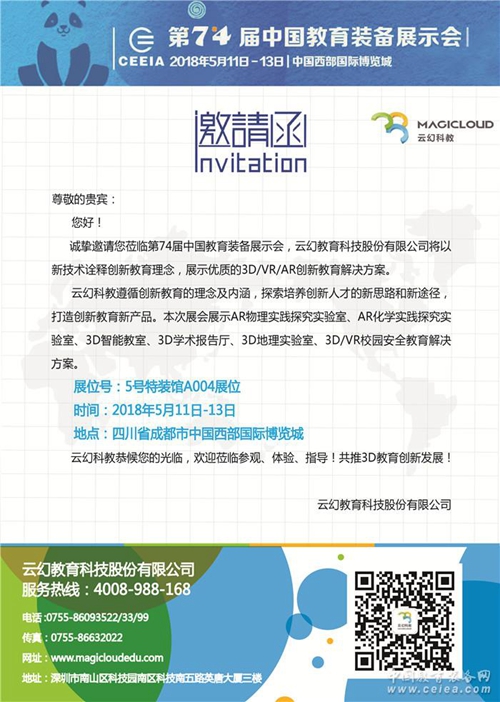 第74屆中國(guó)教育裝備展示會(huì)將于5月11-13日在四川省成都市中國(guó)西部國(guó)際博覽城舉辦,云幻科教誠(chéng)邀教育界領(lǐng)導(dǎo)、朋友蒞臨云幻科教展位,5號(hào)特裝館A004展位,共探3D教育發(fā)展。