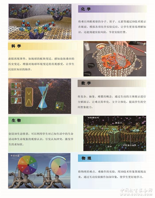 以3D互動(dòng)教學(xué)資源庫(kù)為核心,可選擇3D投影機(jī)、3D一體機(jī)、3DLED等硬件設(shè)備,不僅適用于中小學(xué)常規(guī)教室、實(shí)驗(yàn)室、報(bào)告廳、大禮堂等教學(xué)場(chǎng)所,還適用于校道、飯?zhí)玫裙不顒?dòng)場(chǎng)所。