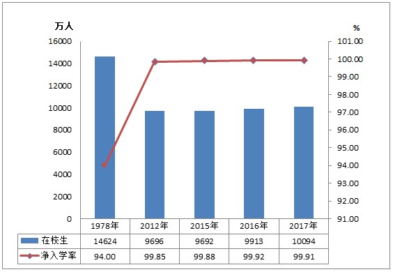 圖2 1978年、2012年、2015-2017年小學(xué)在校生和凈入學(xué)率